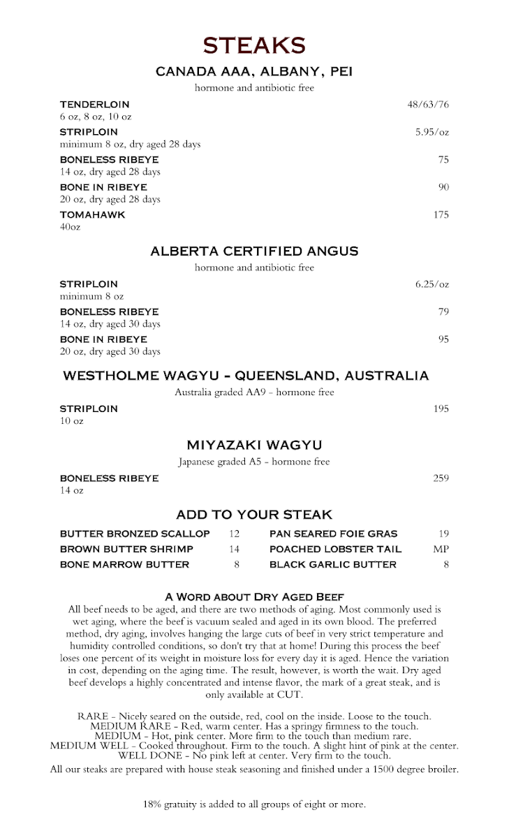 Service here is notably attentive, with waitstaff ready to cater to your needs and offer fantastic recommendations. Whether you're indulging in a classic steak or enjoying thoughtfully crafted sides, CUT Steakhouse promises a memorable culinary journey that’s sure to impress. Make your reservation today and savor the extraordinary!